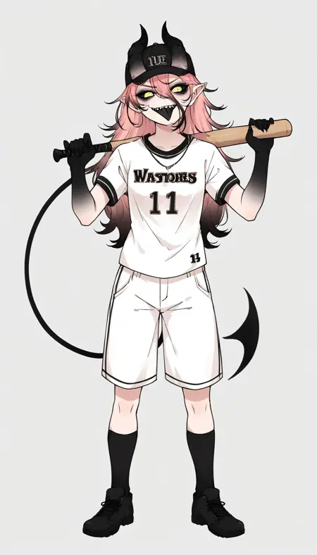 役立つタグ: PickleVT, 悪魔, 角, ピンクの髪, 多色の髪, 暗い目, 黄色い目, エルフの耳, メイク, ブラックなリップ, 悪魔の尾, 尖った歯,