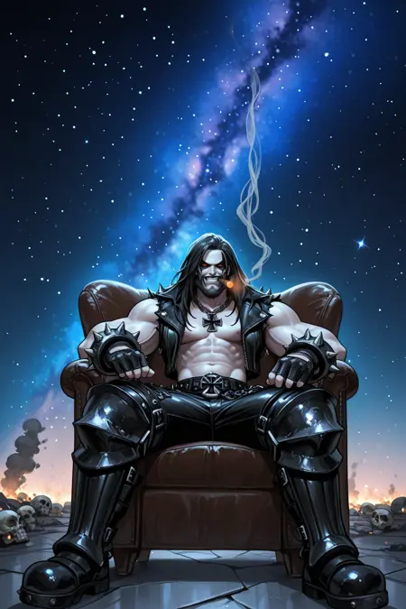 Trigger : lbo, pale skin, long hair, red eyes, no pupils, face paint, beard, leather vest, fingerless gloves, chains, skulls, belt, leather pants, knee pads, iron cross necklace, buckle, spikes, boots, shirt