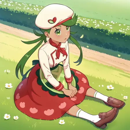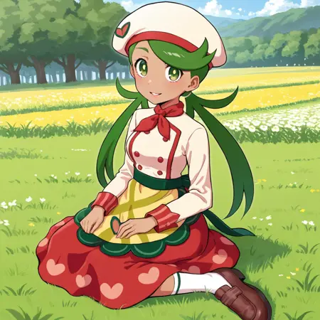 pmallow, mallow \(pokemon\), 녹색 눈, 녹색 머리, 낮은 트윈테일, 스윕 앞머리, 긴 머리, 검은 피부를 가진 여자