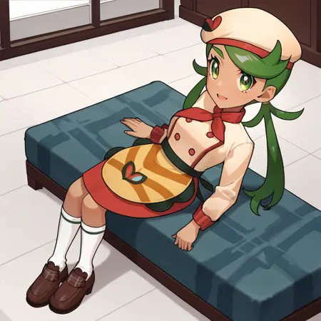 pmallow, mallow \(精灵宝可梦\)、绿色眼睛、绿色头发、低双马尾、斜刘海、长发、深色皮肤女性