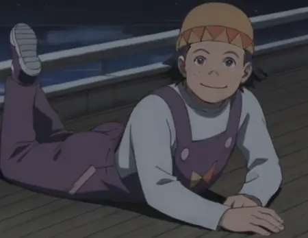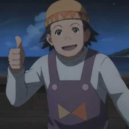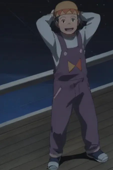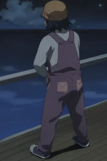 プロンプト: 男性、がっしりした体格、茶色の髪、黒い目、帽子、ほくろ、薄紫色のシャツ、長袖、紫色のオーバーオール、靴、屋外(桟橋)、屋外(漁船)