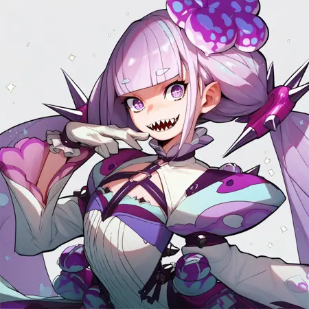 触发词: Dorothy Dragalia,紫色眼睛,紫色头发,白色头发,有獠牙的嘴巴,尖锐的牙齿,异常长的头发,发髻,带刺的发圈,平坦的胸部,白色裙子,宽大的袖子,手套,过膝袜