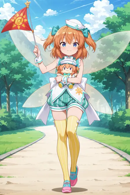 sunny milk, 1girl, solo, blue eyes, orange hair, long hair, two side up, fairy, fairy wings, sunny milk \(radiant rides\), alternate costume, alternate headwear, white hat, sailor hat, hair bow, aqua bow, two-tone bowtie, aqua bowtie, white bowtie, white shirt, print shirt, sun print, sleeveless shirt, lace-trimmed shirt, wrist cuffs, back bow, white bow, green shorts, vertical-striped shorts, yellow thighhighs, vertical-striped thighhighs, two-tone shoes, blue shoes, pink shoes, holding flag, holding stuffed toy,