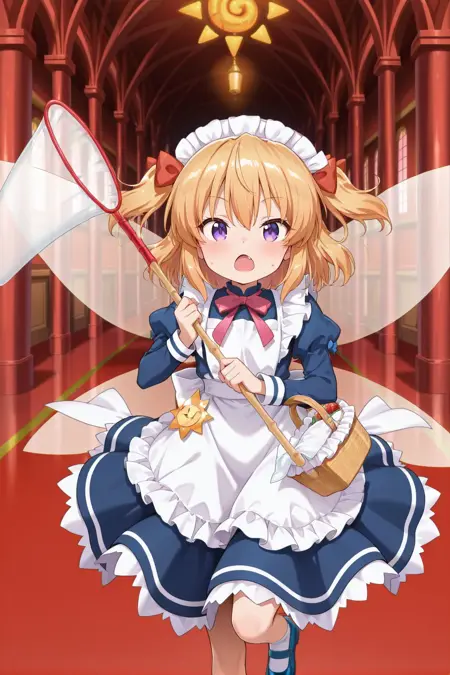 sunny milk, 1girl, solo, blue eyes, orange hair, long hair, two side up, fairy, fairy wings, sunny milk, 1girl, solo, purple eyes, blonde hair, long hair, loose hair strand, two side up, fang, fairy, fairy wings,, sunny milk \(scarlet\), alternate costume, maid headdress, hair ribbon, red ribbon, pink neck ribbon, blue dress, long sleeves, maid apron, white apron, frilled apron, sun pin, white socks, blue shoes, holding butterfly net, holding picnic basket,