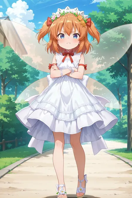 sunny milk, 1girl, solo, blue eyes, orange hair, long hair, two side up, fairy, fairy wings, sunny milk \(white sun fairy\), alternate costume, white headdress, hair flower, hair ribbon, red ribbon, sun hair ornament, red neck ribbon, wedding dress, white dress, sleeveless dress, arm ribbon, back bow, white bow, sandals, footwear flower, holding basket,