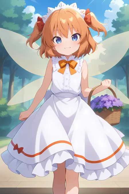 sunny milk, 1girl, solo, blue eyes, orange hair, long hair, two side up, fairy, fairy wings, sunny milk \(white sun fairy\), alternate costume, white headdress, hair flower, hair ribbon, red ribbon, sun hair ornament, red neck ribbon, wedding dress, white dress, sleeveless dress, arm ribbon, back bow, white bow, sandals, footwear flower, holding basket,