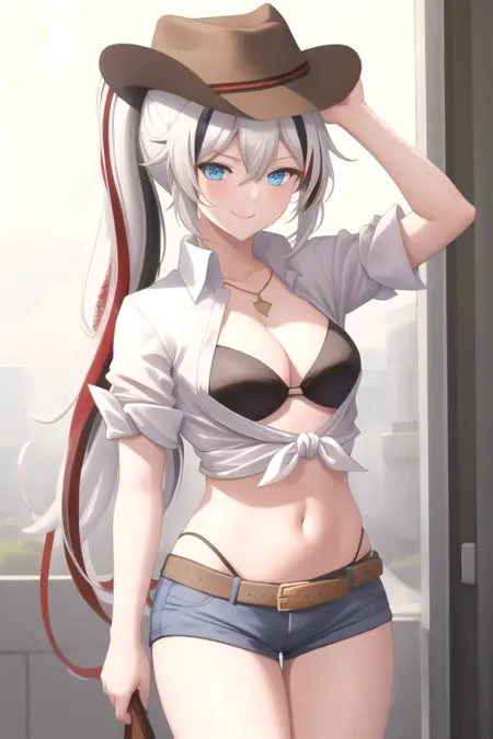 | Trained Words | KianaSumm3r22, 1girl, solo, long hair, smile, blue eyes, white shirt, navel, holding, cleavage, hair between eyes, jewelry, medium breasts, ponytail, white hair, short sleeves, black bikini, red hair, streaked hair, short shorts, midriff, belt, necklace, highleg, front-tie top, sleeves rolled up, blue shorts, denim shorts, brown headwear, tied shirt, cowboy hat, kiana kaslanaCopied! |