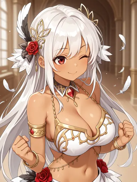 tinia, 1girl, solo, long hair, large breasts, hair ornament, red eyes, jewelry, full body, grey hair, dark skin, bracelet, dark-skinned female, sandals, pelvic curtain, armlet,