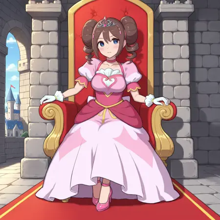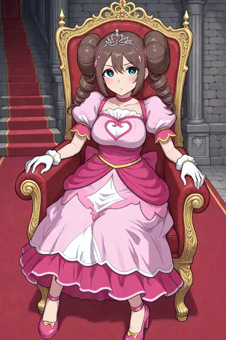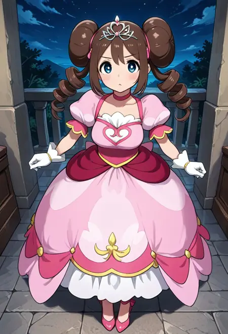 prinrosa, brown_hair, blue_eyes, double_bun, twin_drills, collarbone, pink_dress, very_long_dress, short_sleeves, white_gloves, tiara, pink_footwear, high_heels