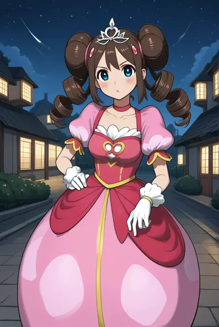 prinrosa, [[rosa_\(pokemon\), brown_hair, blue_eyes, double_bun, twin_drills, collarbone, pink_dress, very_long_dress, short_sleeves, white_gloves, tiara, pink_footwear, high_heels