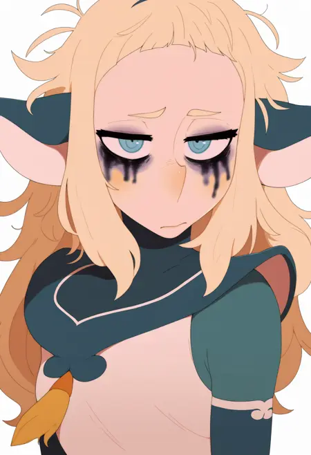 酔っ払いプロンプト:bakaradrunk, pointy ears, bags under eyes, blush, messy hair, runny makeup