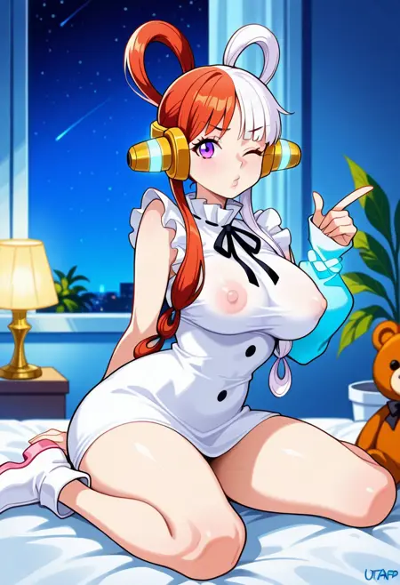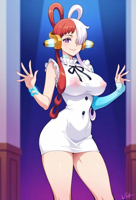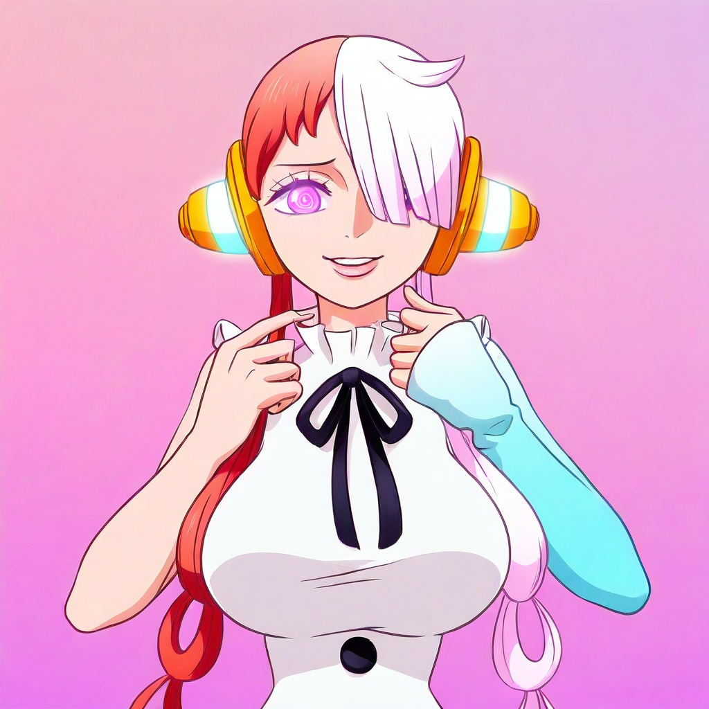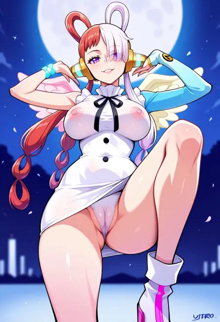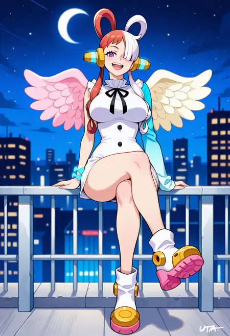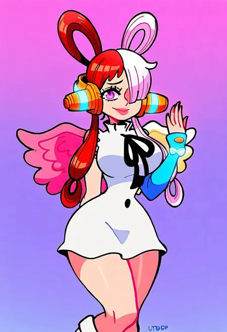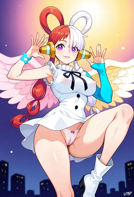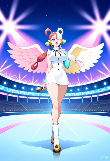 UtaOP,1个女孩,独奏,长发,多色发,分色发,两条长马尾辫各带两个圆辫,发饰,明亮的紫色眼睛,刘海,金色耳机,左眼被白色头发遮盖,双色发,嘴唇,大胸,短白色连衣裙,裙子覆盖大腿,荷叶边领口,脖子上黑色蝴蝶结,黑色纽扣,左臂浅蓝色袖子,单袖,长袖,右臂蓝色手镯,背部有两对羽毛状翅膀,右翼粉红色,左翼白色,宽臀,白色靴子上有多种图案