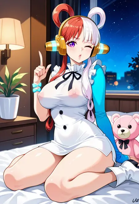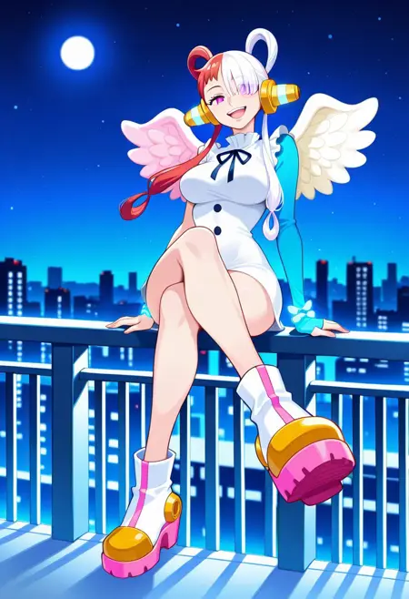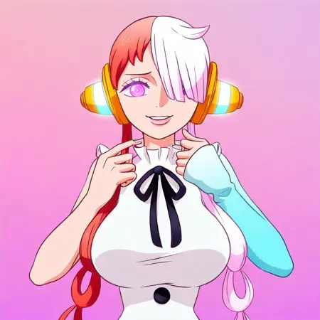 UtaOP、1 girl、ソロ、長い髪、複色髪、二色髪、二つの長いポニーテールに二つの円形の編み込み、髪飾り、明るい紫の目、前髪、ゴールデンのヘッドフォン、左目は白い髪に隠れている、二色髪、唇、大きな胸、短い白いドレス、ドレスの太もも部分、フリルのネックライン、首元の黒いリボン、黒いボタン、左腕にライトブルーの袖、片袖、長い袖、右腕に青いブレスレット、背中に羽のような翼が二つ、右の翼はピンク、左の翼は白、幅広の hips、多数のデザインが施された白いブーツ