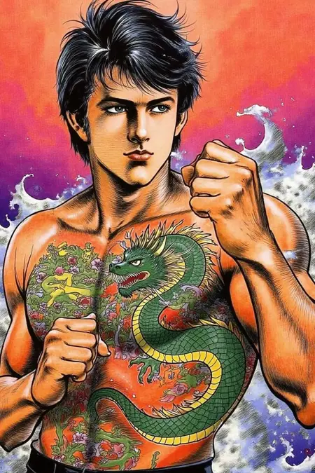 Trained on nineteen, mostly black and white, images by the Japanese master of realistic manga, Ryoichi Ikegami / ๆฑ ไธ้ผไธ. This artist is already 80 years old and is still going strong๐๐๐.