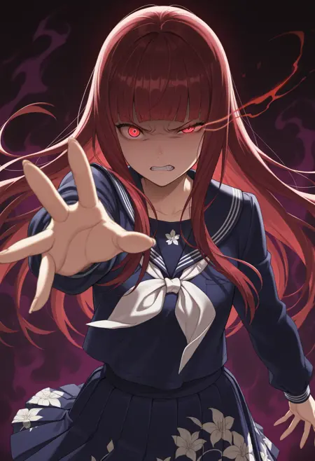 默认外观: sahori,红发,长发,齐刘海,棕眼,校服,蓝色serafuku,白色领结,长袖,百褶裙,花卉图案,印花裙,白色连裤袜,乐福鞋,棕色鞋履
