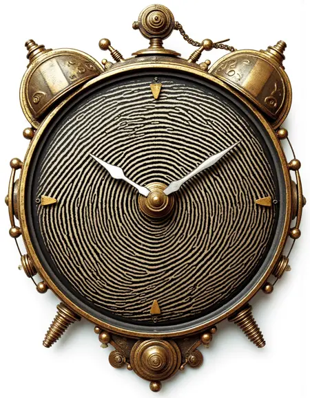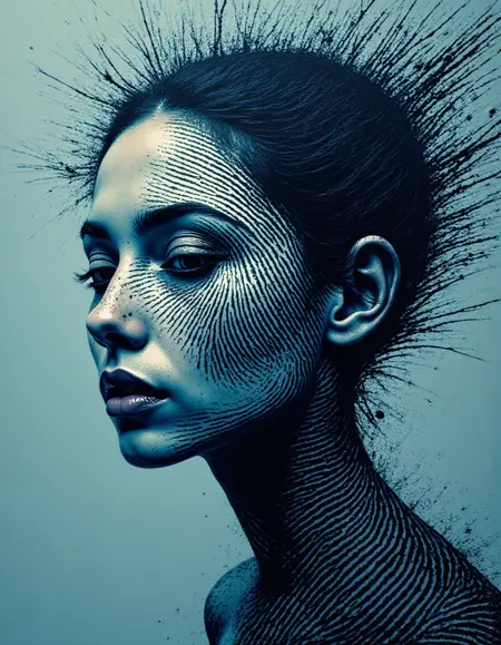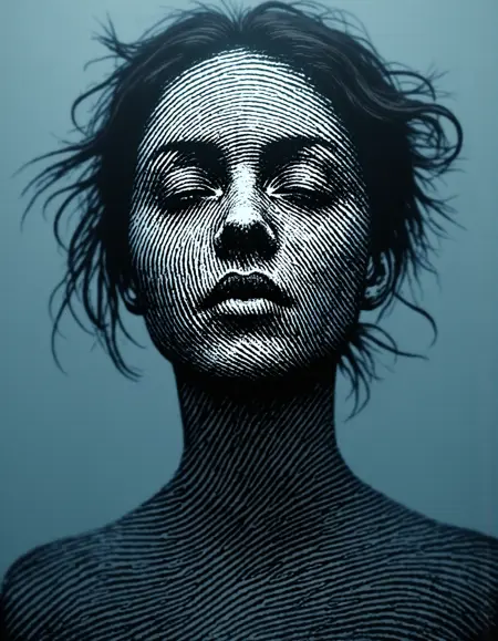 一幅男子肖像,其面部特征与周围环境融化为流动的指纹纹理。