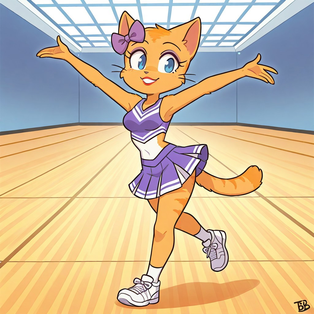anthro, catgirl, tabby cat, furry female, orange fur, Striped fur, blue eyes, purple eyeshadow, red lipstick, purple bow, hair bow,