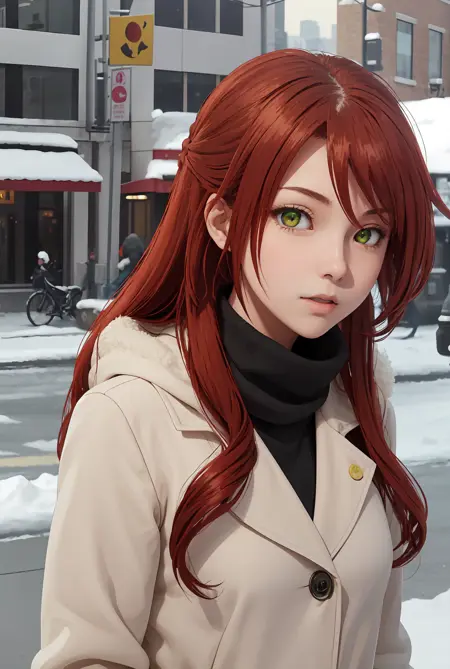 Trigger words : eiko_kawasegawa, long hair, red hair, hair between eyes, bangs, multi-colored eyes, green eyes, yellow eyes