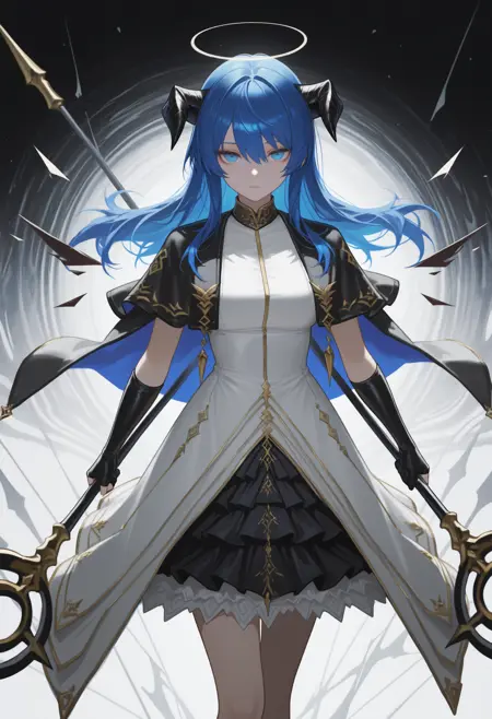 ** Spellbreaker:** most1maspell, 黑色翅膀, 能量翅膀, 分离翅膀, 长发, 蓝色头发, 眼睛间的头发, 黑色角, 恶魔角, 光环, 蓝色眼睛, 黑色短斗篷, 分层连衣裙, 白色连衣裙, 黑色连衣裙, 黑色手套, 肘部手套, 部分露指手套