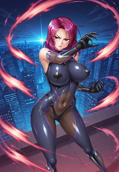 2번째 복장: 바디수트, 어깨 노출, 장갑, 팔꿈치 장갑, 발톱, 꼭 맞는, 배꼽 가림, 피시넷