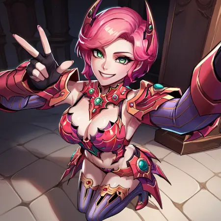CSO_Medea, 1girl, solo, short hair, pink hair, green eyes, breasts, large breasts, armor, bikini armor, midriff, shoulder armor, cleavage , navel, thighhighs, gloves, fingerless gloves, high heels