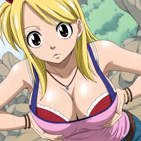 | Trained Words | Lucy Heartfilia, brown eyes, blonde hair, medium hair, bangs, swept bangs, hair partly behind ear, sidelocks, large breasts, round breasts, jewelry, necklace, earrings, camisole, pink camisole, blue straps on camisole, thick blue straps on camisole, red bra, white ruffles on bra, denim jeans, blue denim, hanging breasts, dutch angle, downblouse, downblouse pose, bent over, hands on hips, leaning toward viewer, looking at viewer, Copied! |