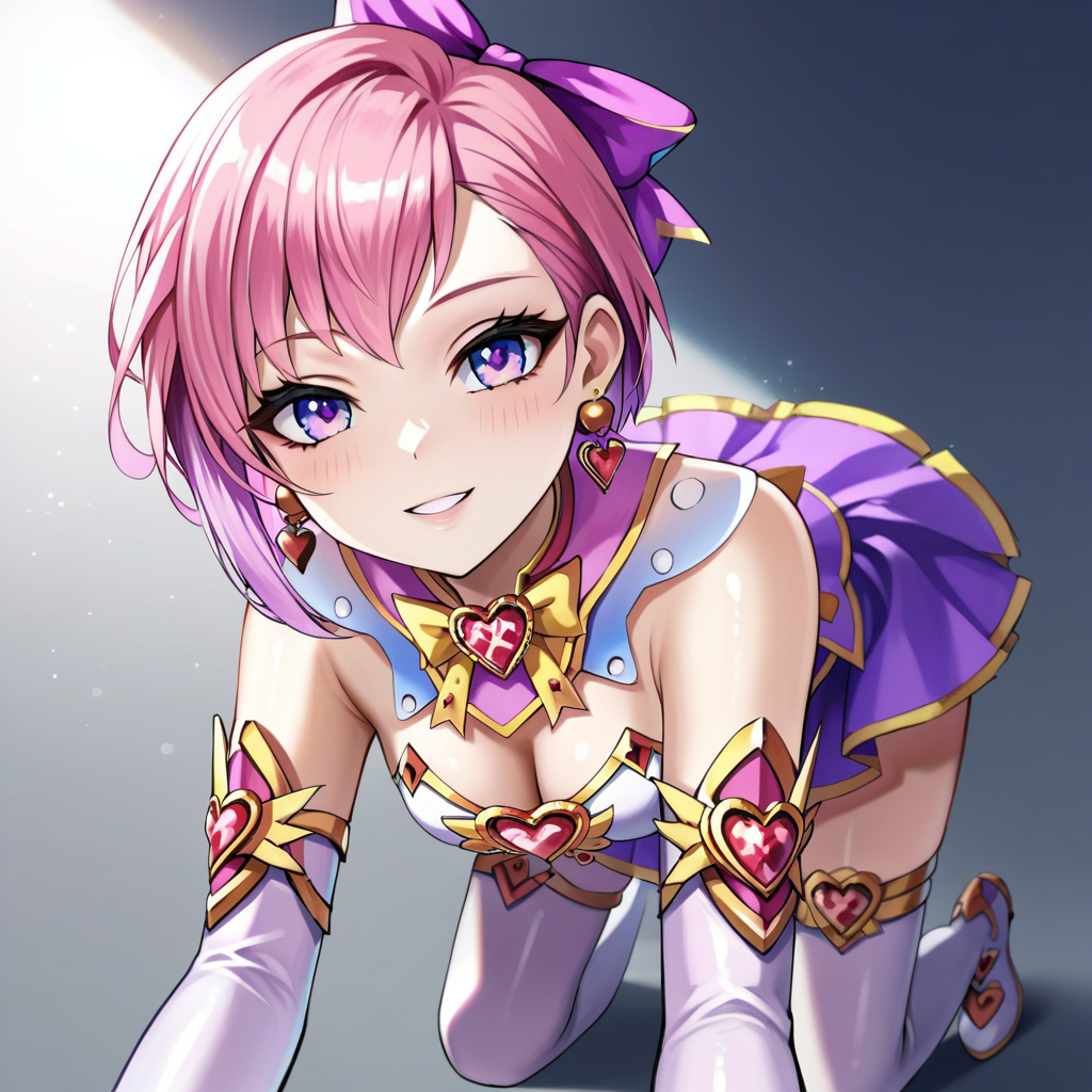 CSO_Pink_Heart_Shiho, 1girl, solo, pink hair, multicolored hair, short hair, hair bow, purple eyes, bare shoulders, magical girl, dress, gloves, white gloves, elbow gloves, earrings, jewelry, skirt, bow, , thighhighs, boots, knee boots