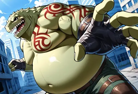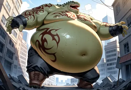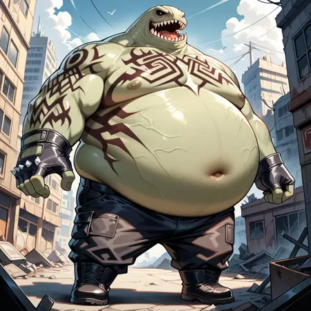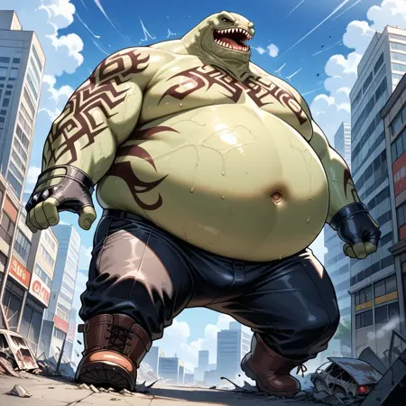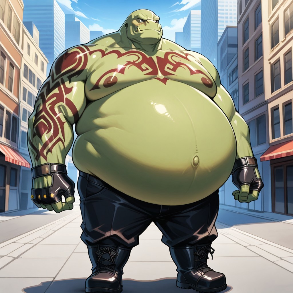 태그: 검은 바지, 손가락 없는 장갑, 문신, 녹색 피부, 날카로운 이빨, 검은 눈, 목 없음, 거대함, 부츠, 벌어진 입, 배 튀어나옴
