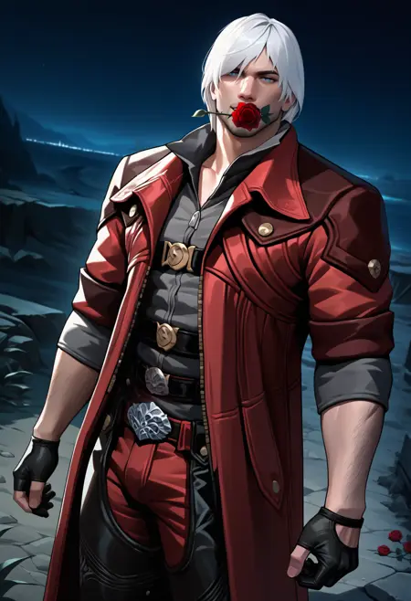 服装标签: 黑色立领衬衫,敞开衣领,胸带,红色外套,风衣,袖子卷起,黑色手套,部分露指手套,扣环,黑色皮裤,红色长裤,牛仔靴
