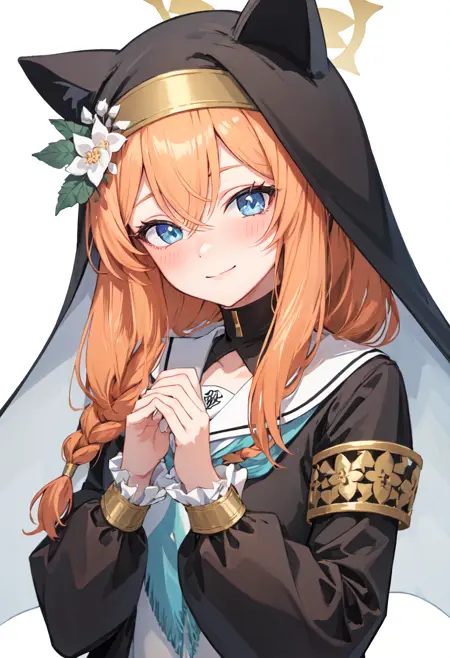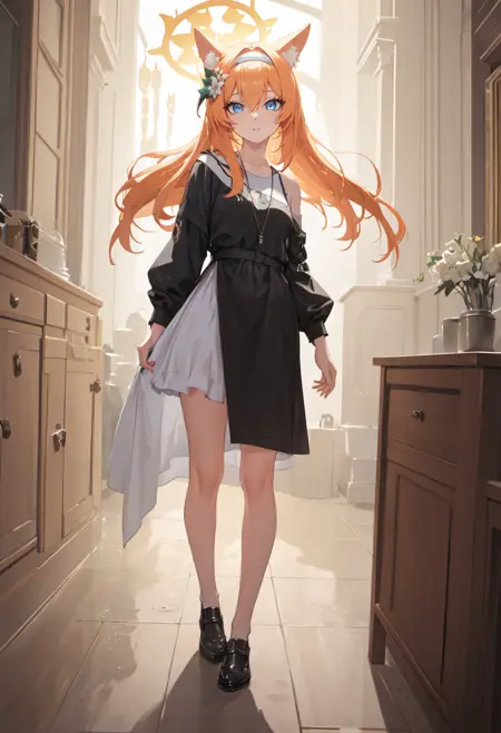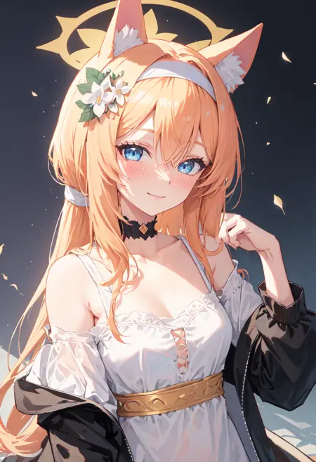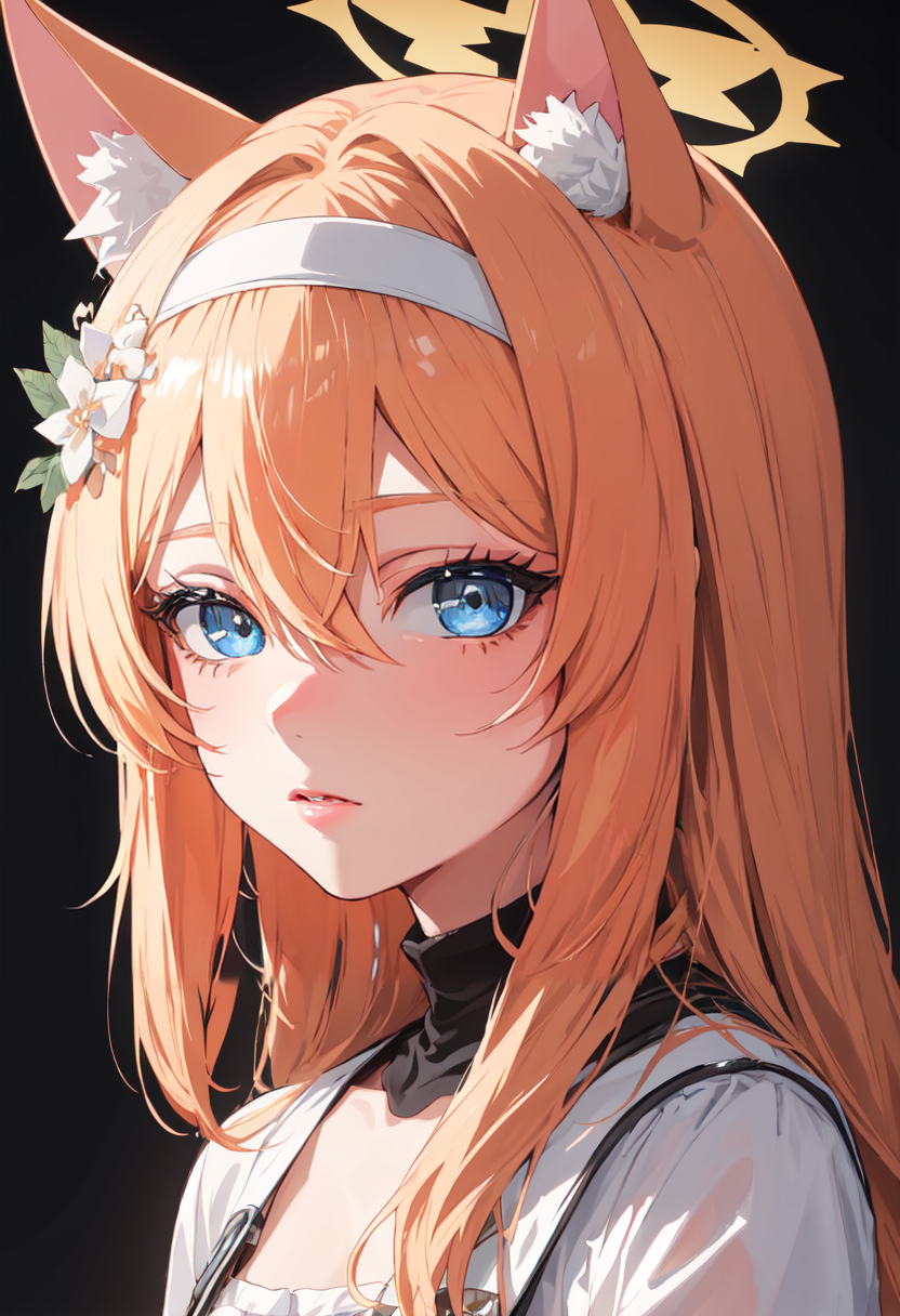- 제거된 캐릭터 태그는 동물 귀, 주황색 머리카락, 긴 머리카락, 할로, 노랑색 할로, 파란 눈, 동물 귀 털, 머리장식, 머리꽃, 눈 사이 머리카락, 헤어밴드, 하얀 헤어밴드, 가슴입니다. 캐릭터의 핵심 특징(예: 머리색)이 안정적이지 않을 경우 이러한 태그를 프롬프트에 추가할 수 있습니다.