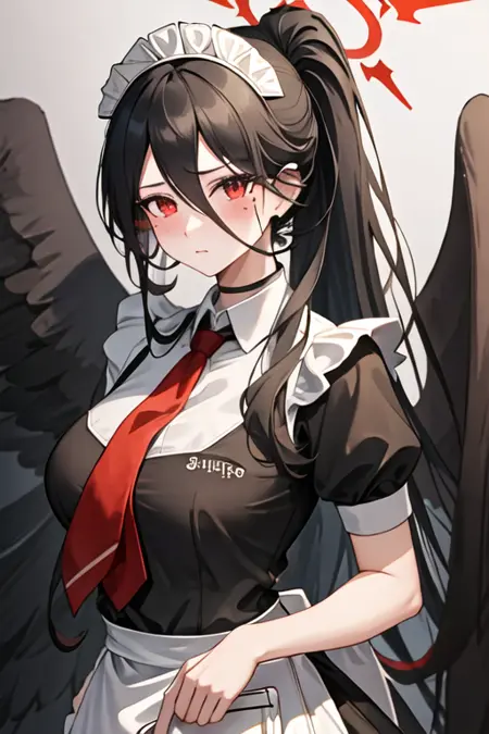 The trigger word is hasumi_bluearchive, and the pruned tags are black_hair, long_hair, breasts, hair_between_eyes, red_eyes, halo, mole, mole_under_eye, wings, black_wings, large_breasts, very_long_hair, feathered_wings, ponytail, huge_breasts, low_wings. When some features (e.g. hair color) are not so stable at some times, you can add these them into your prompt.