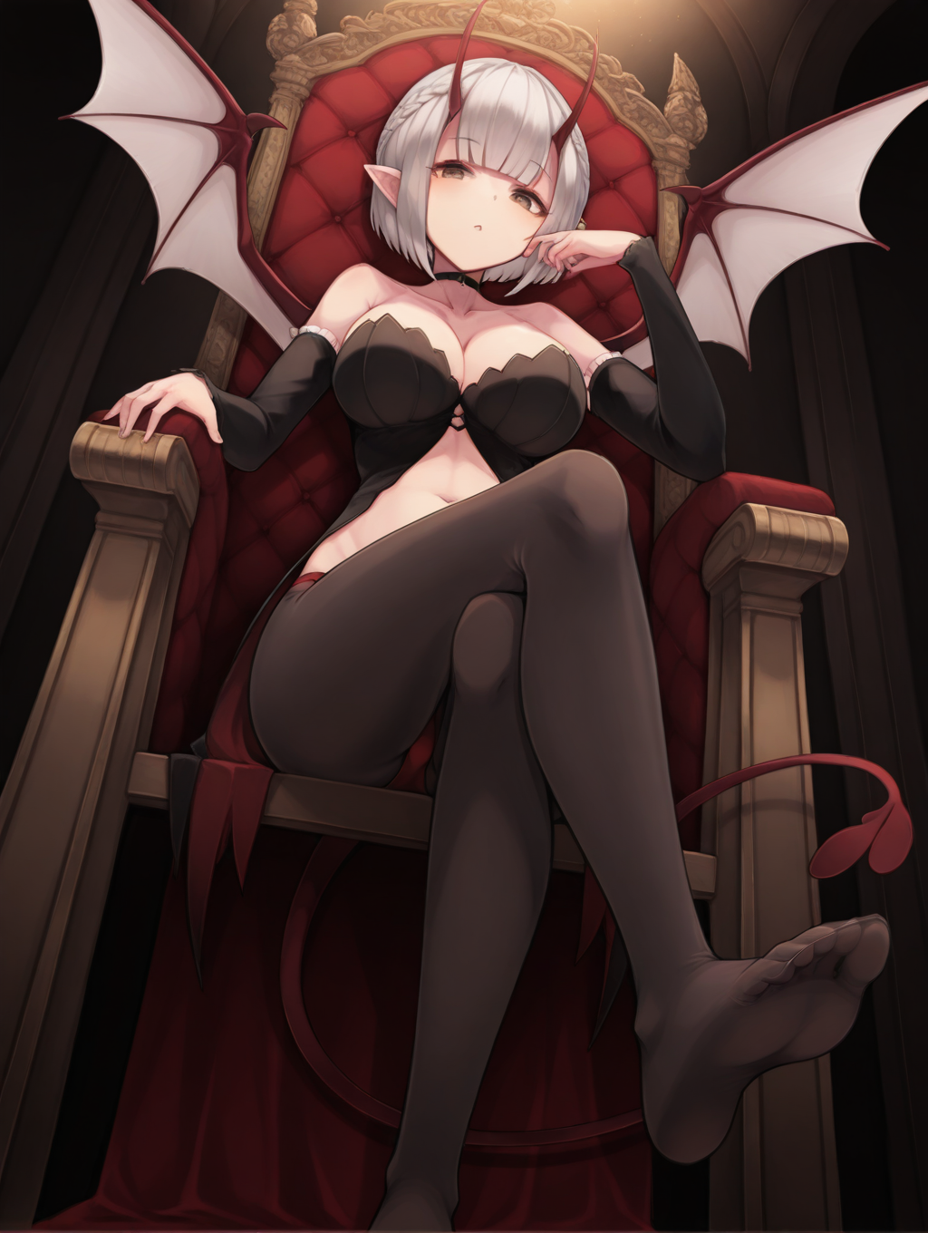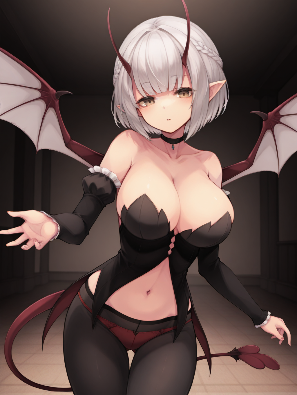 풀베우아, 흰 머리, 단발, 땋은 머리, 갈색 눈, 뾰족한 귀, 뿔, 큰 가슴, 붉은 악마 날개, 흰 날개, 악마 꼬리, 날씬함, 흉선, 어깨 노출, 목걸이, 검은 상의, 떨어지는 꼬리, 분리된 소매, 옷 절개, 배꼽 노출, (팬티하이즈), (붉은 속옷),