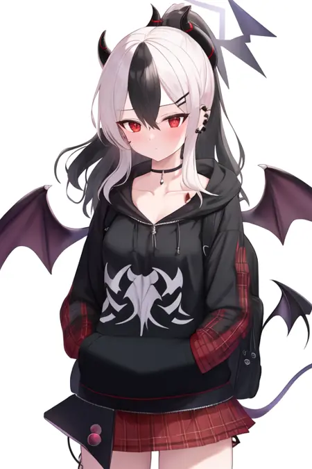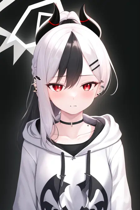 触发词为 kayoko_bluearchive,修剪后的标签为 black_hair, horns, multicolored_hair, white_hair, two-tone_hair, red_eyes, halo, demon_horns, hair_between_eyes, long_hair, black_horns, ear_piercing, breasts, wings, single_wing, ponytail。当某些特征(如发色)有时不够稳定时,您可将这些标签添加到提示词中。