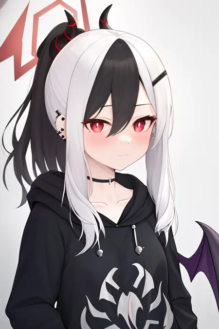 触发词为 kayoko_bluearchive,修剪后的标签为 black_hair, horns, multicolored_hair, white_hair, two-tone_hair, red_eyes, halo, demon_horns, hair_between_eyes, long_hair, black_horns, ear_piercing, breasts, wings, single_wing, ponytail。当某些特征(如发色)有时不够稳定时,您可将这些标签添加到提示词中。