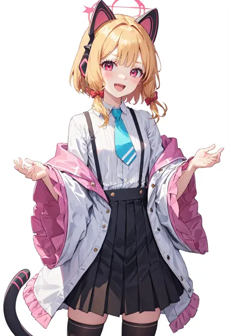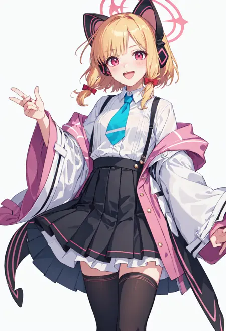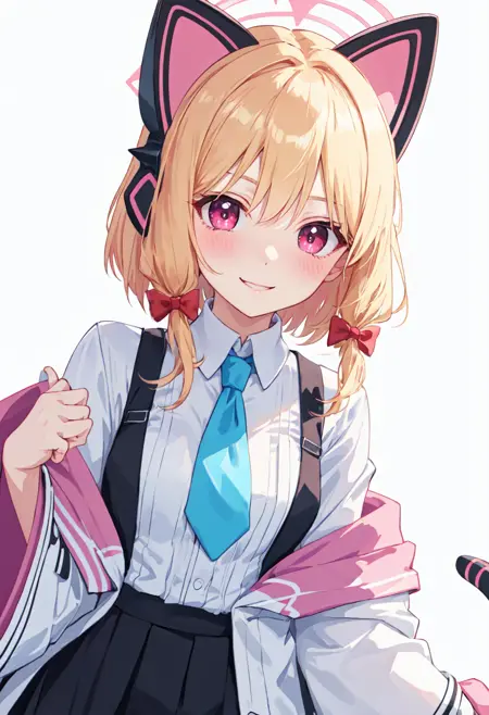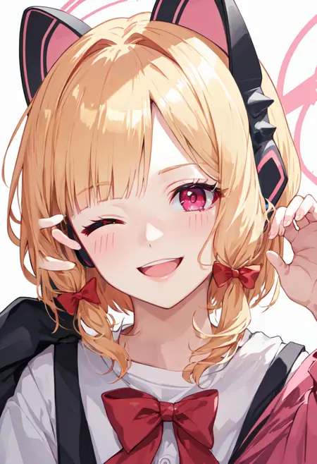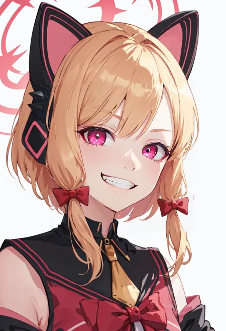 The trigger word is momoi_bluearchive, and the pruned tags are blonde_hair, animal_ears, fake_animal_ears, animal_ear_headphones, headphones, short_hair, bow, halo, cat_ear_headphones, hair_bow, red_bow, pink_eyes, pink_halo, tail, cat_tail, red_eyes. When some features (e.g. hair color) are not so stable at some times, you can add these them into your prompt.