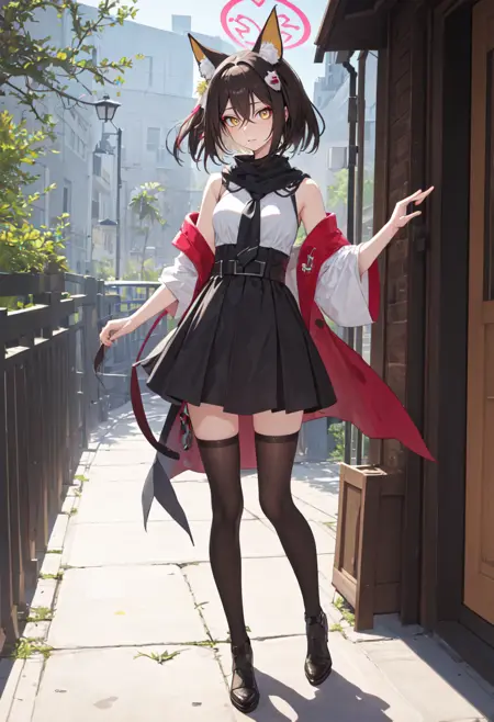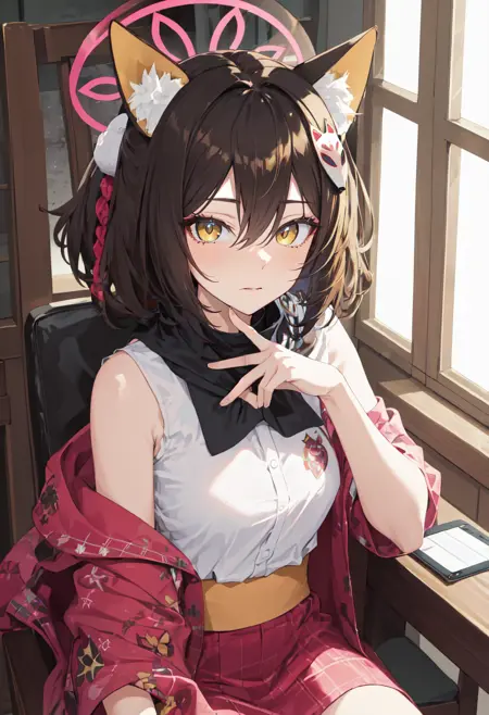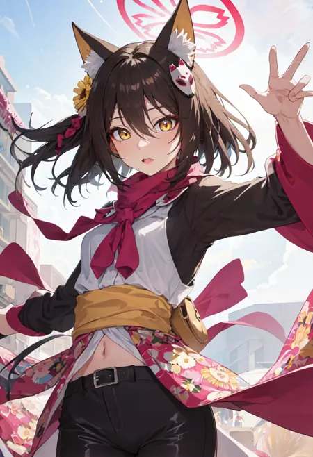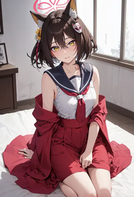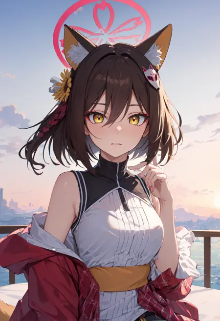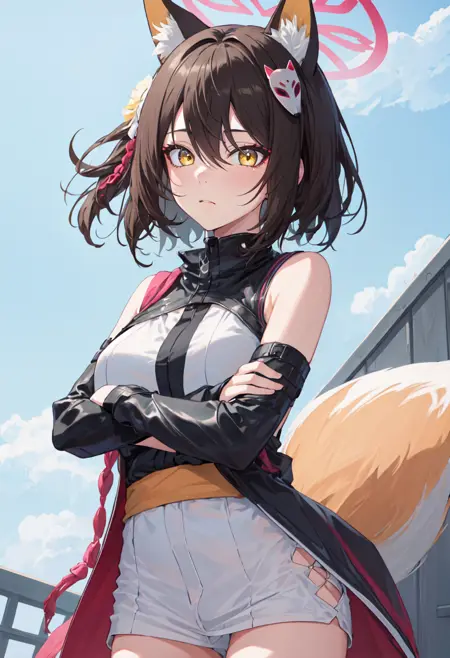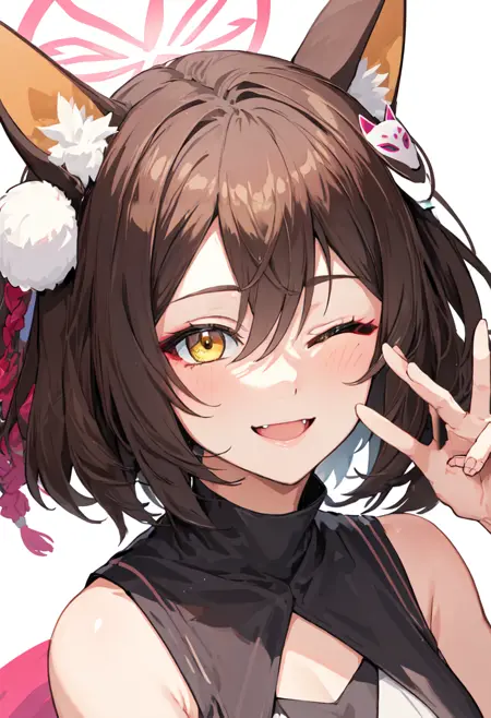トリガーワードはizuna_bluearchive、削減されたタグはanimal_ears, fox_ears, fox_girl, animal_ear_fluff, yellow_eyes, brown_hair, pink_halo, halo, short_hair, fox_tail, tail, hair_ornament, breasts, hair_between_eyes, fang, medium_breasts, skin_fang, visor_capです。あるときキャラクターの一部の特徴(例:髪の色)が安定しない場合、これらのタグをプロンプトに追加できます。