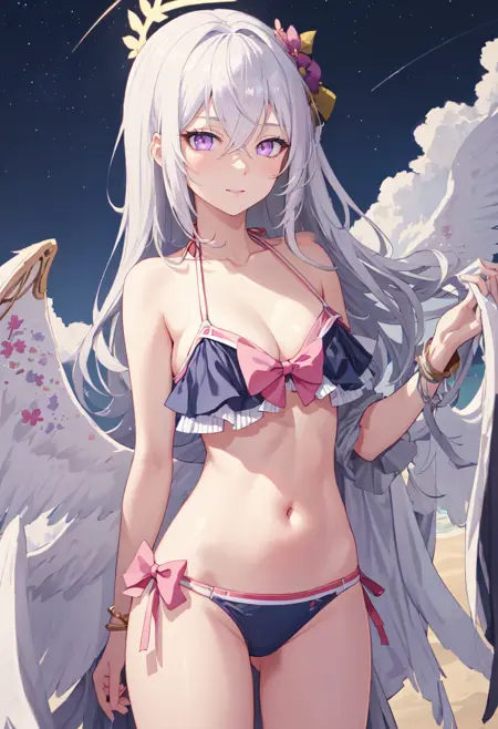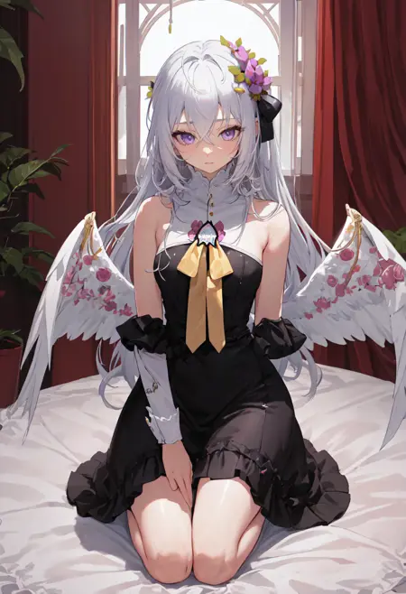 - 精简后的角色标签包括:长发、眼睛间的头发、光环、白发、发饰、发花、紫眼、翅膀、白翅、羽毛翅、天使翅、交叉刘海、粉眼。当角色的核心特征(如发色)不够稳定时,您可以在提示词中添加这些标签。