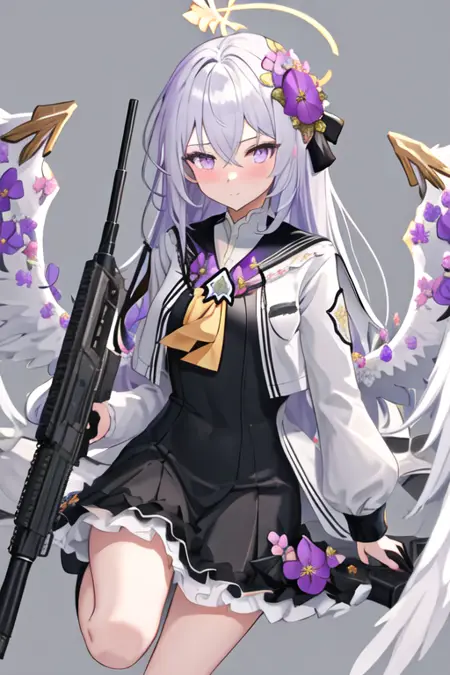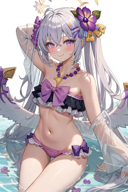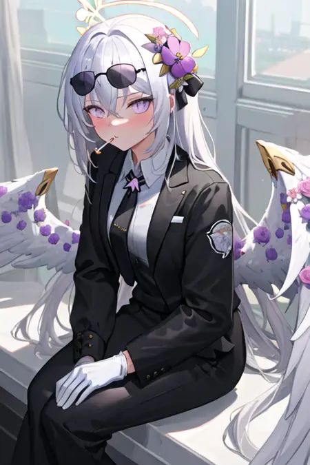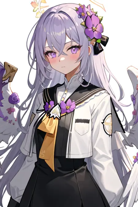 - The pruned character tags are long hair, hair between eyes, halo, white hair, hair ornament, hair flower, purple eyes, wings, white wings, feathered wings, angel wings, crossed bangs, pink eyes. You can add them into prompts when core features (e.g. hair color) of character is not so stable.