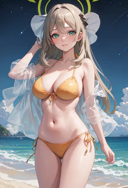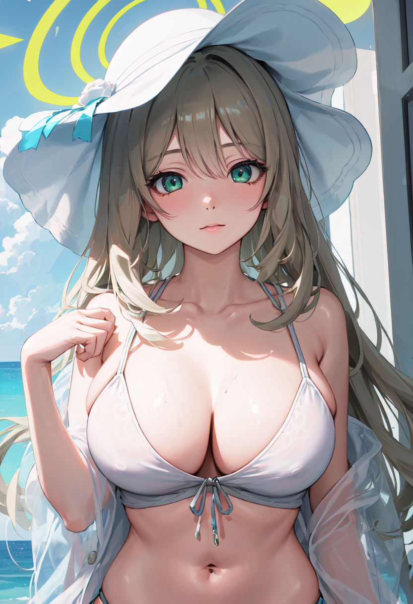 触发词为 nonomi_bluearchive,精简标签为 long_hair, breasts, halo, green_eyes, large_breasts, light_brown_hair, hat, sun_hat, white_headwear。当某些特征(如发色)有时不够稳定时,您可将这些标签加入提示词中。