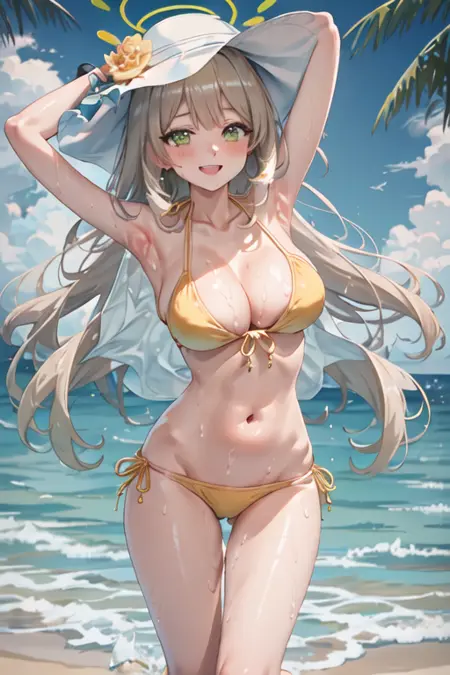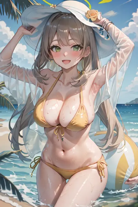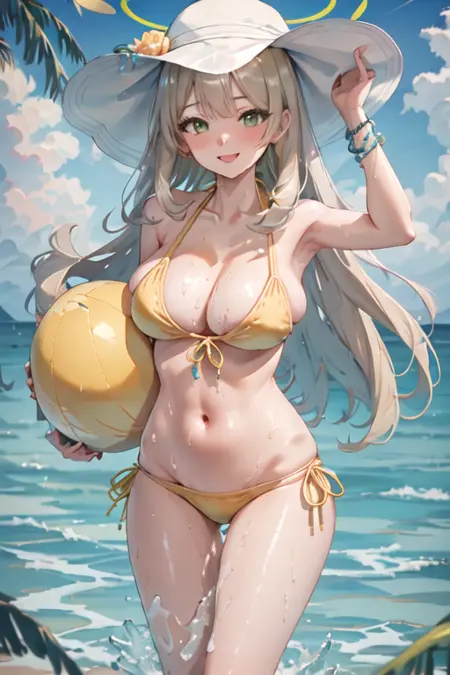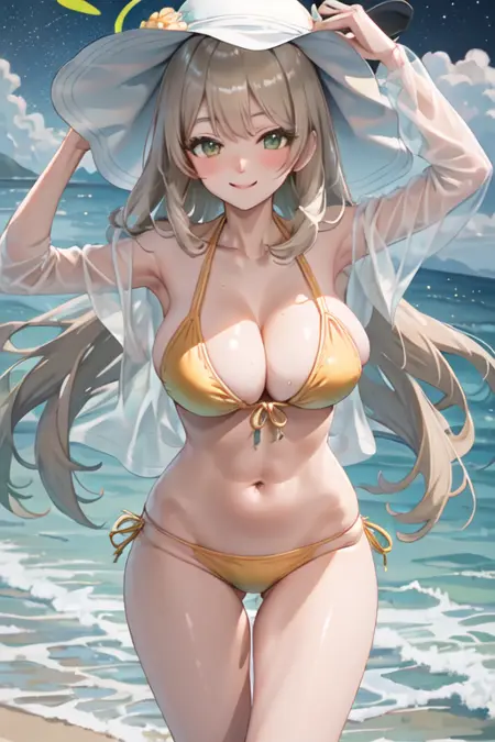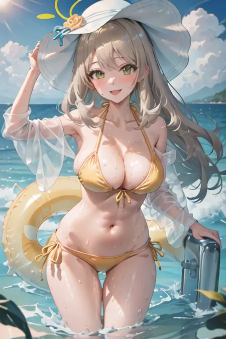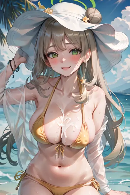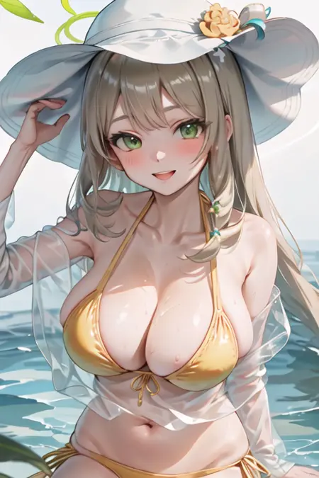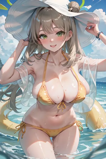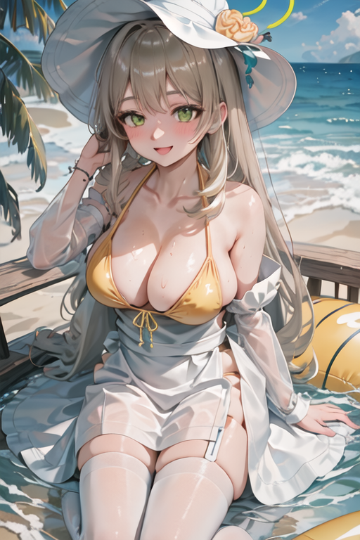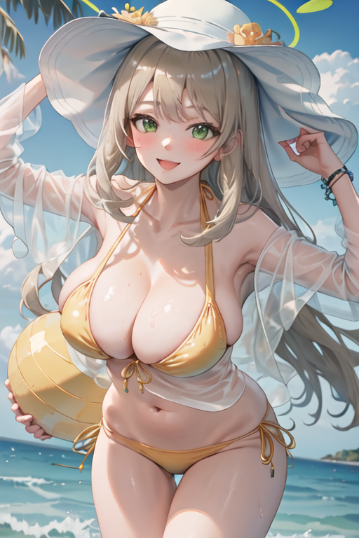 트리거 단어는 nonomi_bluearchive이며, 축소된 태그는 long_hair, breasts, halo, green_eyes, large_breasts, light_brown_hair, hat, sun_hat, white_headwear입니다. 어떤 특징(예: 머리색)이 불안정할 때, 이 태그를 프롬프트에 추가하세요.