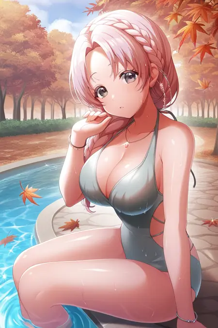hiiro, 1girl, breasts, swimsuit, solo, one-piece swimsuit, outdoors, large breasts, sky, cleavage, hair bun, jewelry, water, cloud, necklace