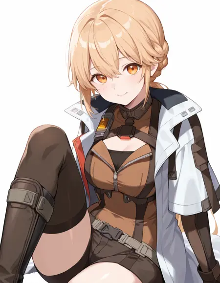 Grozadef, grz_shirt, grz_coat, open coat, grz_straps, grz_shorts, grz_belts, grz_gloves, grz_single_thighhigh, grz_knee_boots