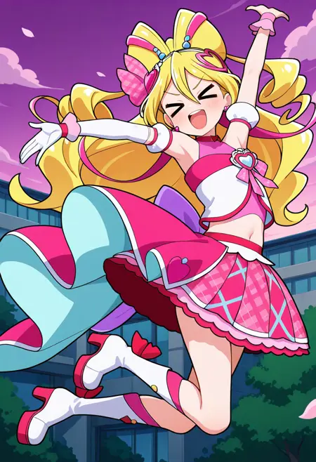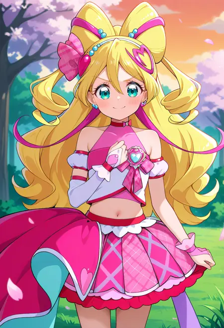 cure idol, blonde hair, ponytail, very long hair, two-tone hair, multicolored hair, twin drills, pink hair, streaked hair, shiny hair, hair between eyes, curly hair, big hair, hair bow, hair ribbon, pink bow, plaid bow, heart hair ornament, hair beads, white hairband, blue eyes, eyelashes, eyebrows visible through hair, heart earrings, pink dress, detached sleeves, puffy short sleeves, white sleeves, mismatched sleeves, bare shoulders, pink skirt, layered skirt, plaid skirt, waist bow, huge bow, heart brooch, wrist cuffs, arm warmers, pink choker, pink ribbon, frills, midriff, white footwear, knee boots