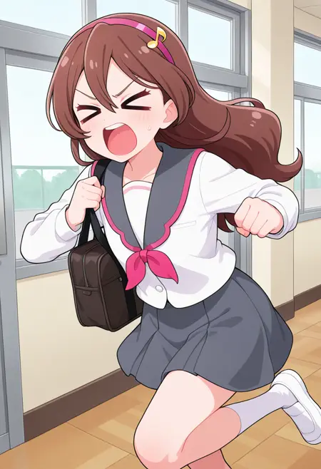 sakura uta, school uniform, brown hair, long hair, pink hairband, hair between eyes, shiny hair, flipped hair, musical note hair ornament, red eyes, eyelashes, eyebrows visible through hair, serafuku, white shirt, grey sailor collar, long sleeves, pink neckwear, grey skirt, pleated skirt, white legwear, white socks, brown footwear, loafers