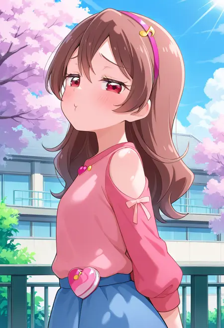 sakura uta, casual, brown hair, long hair, pink hairband, hair between eyes, shiny hair, flipped hair, musical note hair ornament, red eyes, eyelashes, eyebrows visible through hair, pink shirt, shoulder cutout, bare shoulders, long sleeves, pink ribbon, blue skirt, pleated skirt, miniskirt, layered skirt, white legwear, white socks, mary janes, red footwear, pouch校服(仅v2) 学生服 (v2のみ)