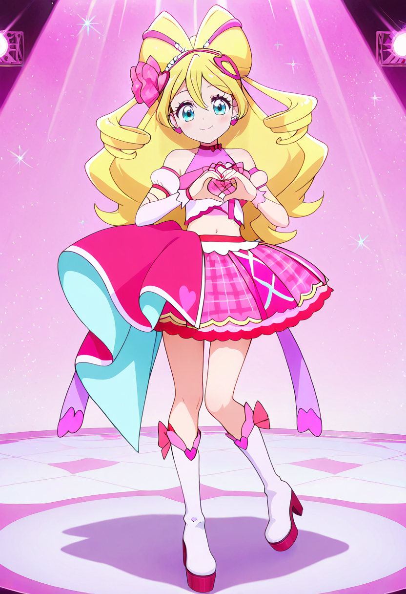 cure idol, blonde hair, ponytail, very long hair, two-tone hair, multicolored hair, twin drills, pink hair, streaked hair, shiny hair, hair between eyes, curly hair, big hair, hair bow, hair ribbon, pink bow, plaid bow, heart hair ornament, hair beads, white hairband, blue eyes, eyelashes, eyebrows visible through hair, heart earrings, pink dress, detached sleeves, puffy short sleeves, white sleeves, mismatched sleeves, bare shoulders, pink skirt, layered skirt, plaid skirt, waist bow, huge bow, heart brooch, wrist cuffs, arm warmers, pink choker, pink ribbon, frills, midriff, white footwear, knee boots