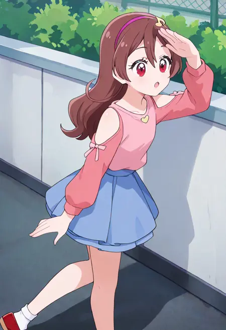 sakura uta, casual, brown hair, long hair, pink hairband, hair between eyes, shiny hair, flipped hair, musical note hair ornament, red eyes, eyelashes, eyebrows visible through hair, pink shirt, shoulder cutout, bare shoulders, long sleeves, pink ribbon, blue skirt, pleated skirt, miniskirt, layered skirt, white legwear, white socks, mary janes, red footwear, pouchSchool uniform (v2 only) 学生服 (v2のみ)