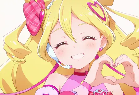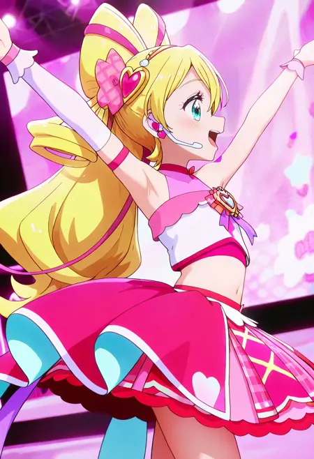 cure idol, blonde hair, ponytail, very long hair, two-tone hair, multicolored hair, twin drills, pink hair, streaked hair, shiny hair, hair between eyes, curly hair, big hair, hair bow, hair ribbon, pink bow, plaid bow, heart hair ornament, hair beads, white hairband, blue eyes, eyelashes, eyebrows visible through hair, heart earringsFull body 全身