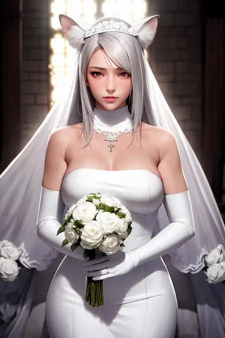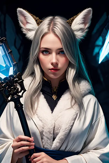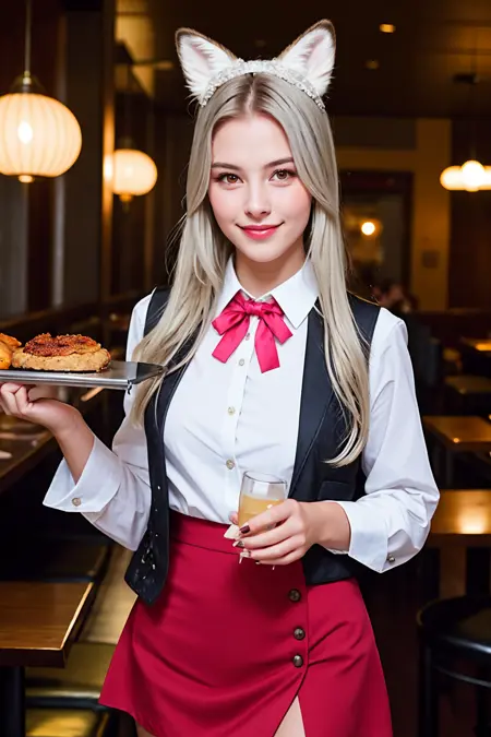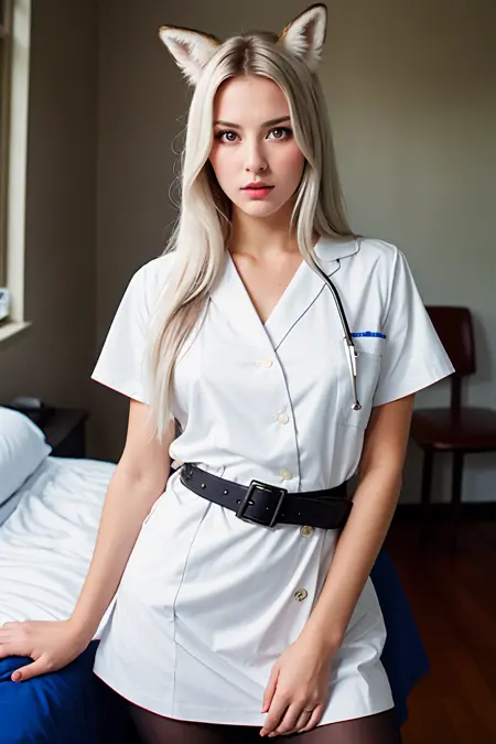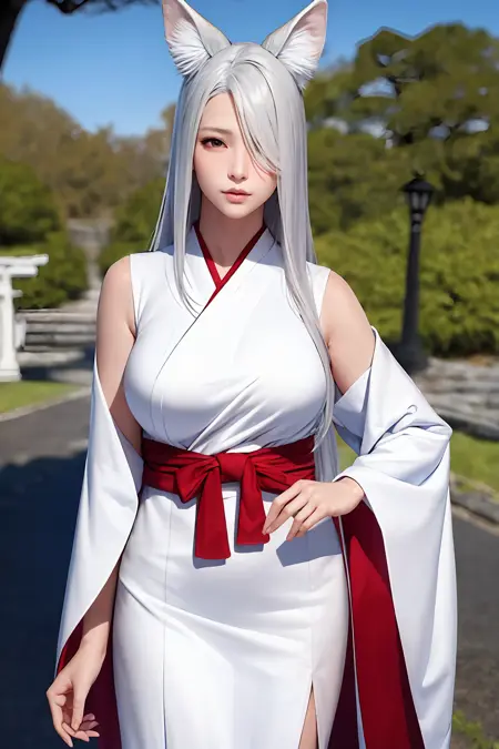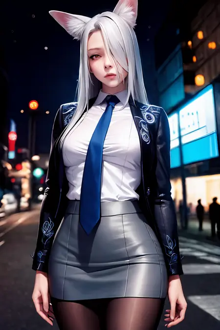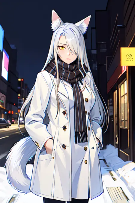 유니폼 착용 시: 동물 귀, 여우 귀, 털 컬러, 털 트림, 한쪽 눈 위의 머리카락, 모자, 긴 머리, 어깨 드리우기, 수직 동공, 여우 꼬리, 흰색 코트, 흰색 장갑, 은색 머리, 흰색 재킷, 흰색 셔츠, 흰색 치마, 노란색 눈