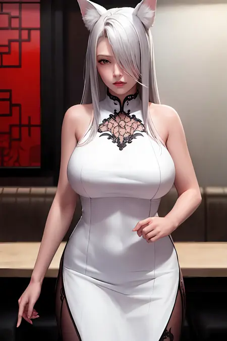 캐릭터만: 동물 귀, 여우 귀, 여우 꼬리, 한쪽 눈 위의 머리카락, 긴 머리, 수직 동공, 은색 머리, 노란색 눈